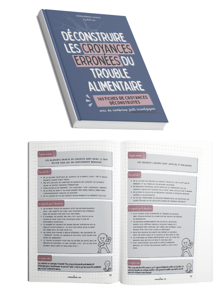 En gros, ton TCA (et parfois la société, et même ton éducation) va te donner un ensemble de croyances erronées. Et ça concerne la nourriture, l’apparence, mais aussi de nombreux autres aspects de ta vie (exemple : parfois au travail, tu te dis que toi, tu dois travailler plus que les autres, car tu es moins intelligent(e). Parfois dans ta vie sentimentale : tu te dis que tu ne mérites pas quelqu’un qui te respecte, que tu dois te dévouer à cette personne pour être aimé, etc). Et en gros, la restructuration cérébrale, c’est identifier ces croyances erronées pour les déconstruire et reconstruire un ensemble de croyances saines. C’est un travail minutieux, qui prend du temps, qui va se faire petit à petit. Ça passe par beaucoup d’introspection personnelle, mais tu peux t’aider avec des thérapies comme les TCC (thérapie cognitivo-comportementale). Pour moi, c’est l’un des aspects de la guérison les plus importants et qui est trop souvent oublié, et qu’en fait, en France, peu de professionnels intègrent. J’ai découvert ça très tard dans ma guérison, en faisant mes propres recherches, vers la fin, quand j’étais en quasi-guérison, donc vers 2020. Et je suis sûre que si je l’avais découvert avant, ça m’aurait aidé plus tôt.